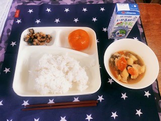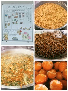 ひじき豆は子どもたちに大人気の献立です。乾燥大豆は熱湯に60分ひたして片栗粉をまぶして揚げてから、ひじき(たっぷりのぬるま湯で戻す)、砂糖、しょうゆを合わせて煮つめて、大豆にからませてます。