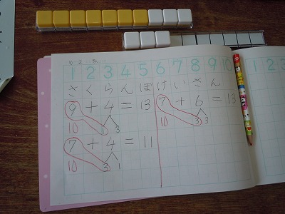 「さくらんぼけいさん」といって、「9+4」を計算するときに「9が10になるにはあと1が必要」「4は1と3に分かれる」「9+1で10、のこりが3」「だから答えは13」と計算していきます。