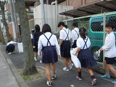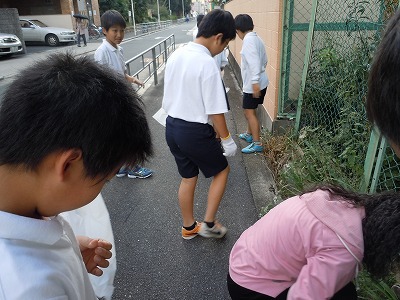 美化委員会では、今まで、校内の美化活動を行ってもらっていましたが、今日は地域に出で、自分たちもよく遊んでいるかぶと公園と公園に行くまでの道路の清掃活動を行いました。
