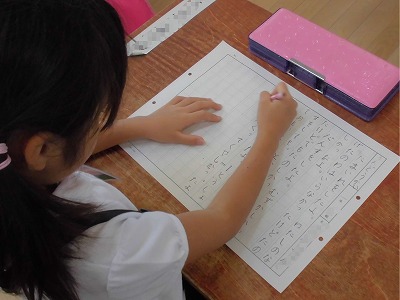 日曜日にあった「運動会」についての作文で、400字づめの原稿用紙に、玉入れのこと、ダンスのこと、かけっこのこと、応援のこと、白組が勝ったことなど、先生にヒントをもらいながら、短い文ではありますが、自分で表現を考えて、作文用紙に書いていました。