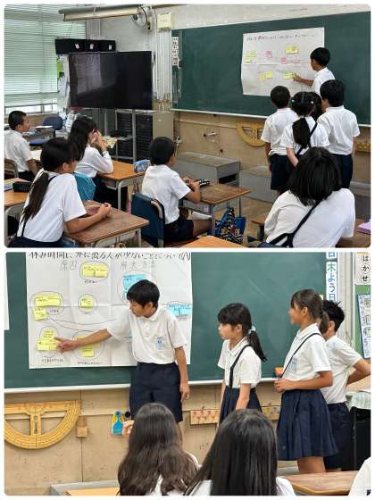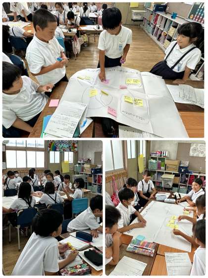 国語科で、「問題を解決するために話し合おう」の学習を行いました。みんなで議題を決め、グループに分かれて話し合いを行い、話し合ったことを共有しあいました。どのグループも積極的に意見を出し合い、考えを深めることができました。