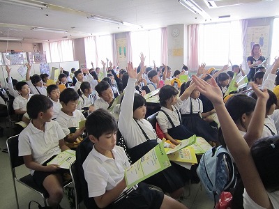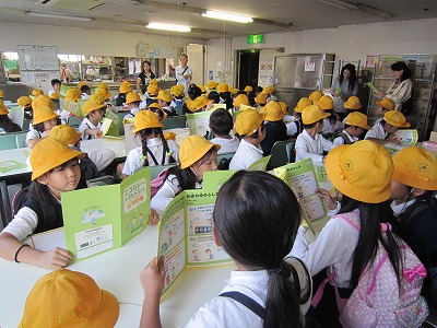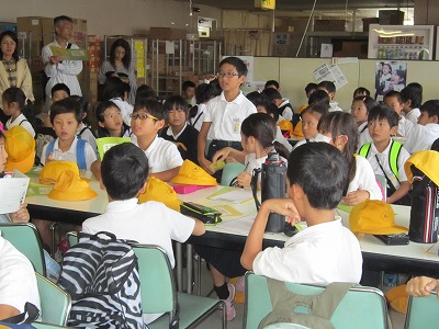 イズミヤでは、地球と人にやさしい商品に緑色のマーク(ハートフルマーク)をつけて売っていることや、レジで見かけるカードにはどんな意味があるのか(レジ袋不要カード)、リサイクルできる品物の箱についての説明など、子どもたちは熱心に聞いてきました。