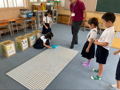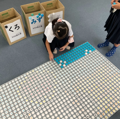 夏休み中にたくさん集めていただいたペットボトルキャップを1・2年生で色分けし、運営委員会でキャップの数を集計しました。そして、児童から募集をかけ最優秀賞に選ばれたイラストをキャップで描いていきます。