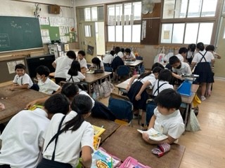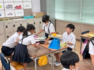 重さの学習が始まりました。今まで見たことのある重さを測るものについて何がある?と尋ねたところ、「保健室にある体重計!」「家のキッチンでみたことがあるけど名前が…」と言っている子がいました。「はかり」という名前を出すと「あ〜!」「知ってる!」などの普段見慣れていることから使い方を知っている児童もいました。今日は、全体で使い方について学習し、班で協力して1000gの重さを乗せたり、855gを乗せたりしました。その後も、様々な重さに挑戦しました。30秒ほどで正しい重さに乗せることができ、楽しみながら取り組むことができました。