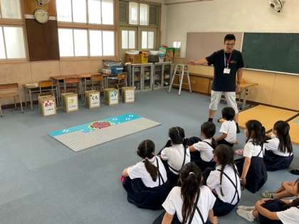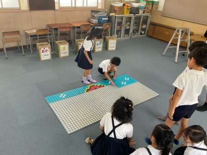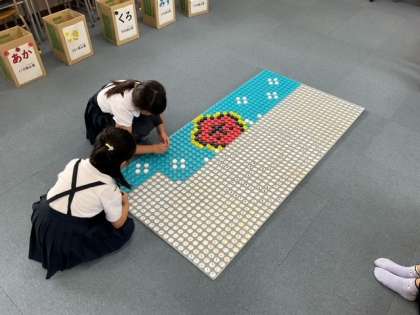 今日は、2年生が作品作りに取り組みました。一人4個ずつキャップをはめていきました。徐々に校章が浮かびあがってくると思わず「おぉー」と声が出ていました。2年生に感想を聞くと