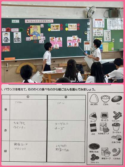 また赤・黄・緑の栄養をバランスよくとることが大切と知り、朝食のメニューを自分たちで考えました。