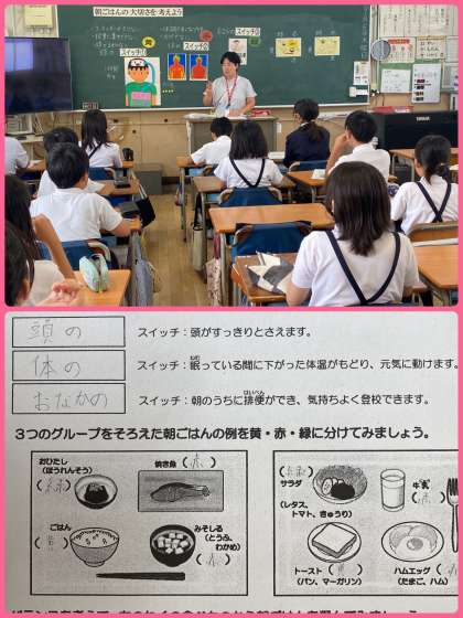 栄養教諭の先生方に来校していただき、朝ごはんはどうして食べるべきなのかを教えていただきました。