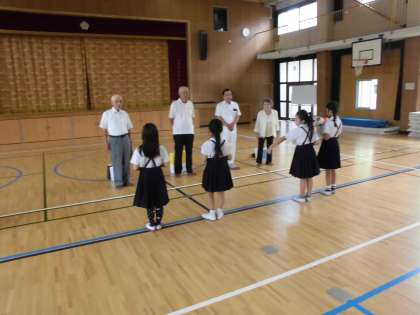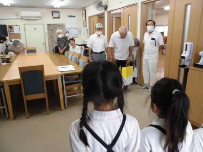 代表の人の言葉を聞き、大変喜んでおられました。お礼に、敬老会の方から「ぞうきん」をいただきました。お掃除の時を使って、これからも学校を綺麗にしていきます。ありがとうございました。
