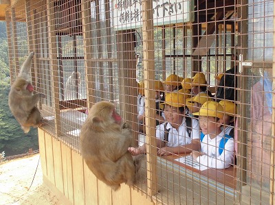 一人ひとりピーナッツを1つ係り員さんからいただき、ネット越しのお猿さんに与えます。
