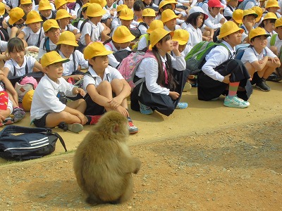 パークに着き、係り員さんから説明を受けているのですが、お猿さんも一匹、代表でみんなとお話を聞いていました。