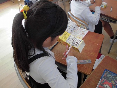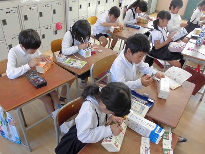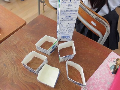 このクラスでは、お家から持ってきてもらった牛乳パックを使って工作をしていました。