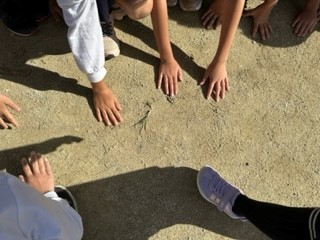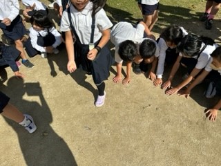 今日は、日なたと日かげの地面のようすの違いについて運動場へ調べに行きました。まず、教室で「日なたのようすってどうかな?」と聞きました。「あついです!」「明るい!」「土がサラサラ!」など自分の経験をもとにたくさんの予想が出てきました。次に「日かげはどうかな?」と聞くと、「地面は冷たいと思う!」「少し暗い感じがする。」「じめじめしている。」という同じくたくさんの予想が出てきました。実際に、活動しにいくと…予想通りの結果でした!