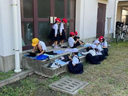 タブレットを持った1年生が豊新の森で学習しています!