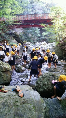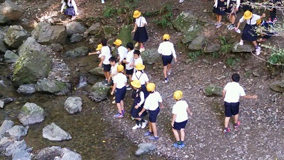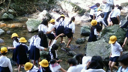 初めは様子を見ていた子ども達も、靴下を脱いで川の中へ。