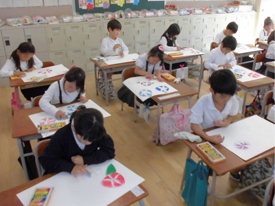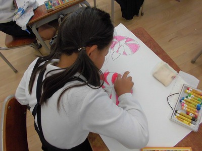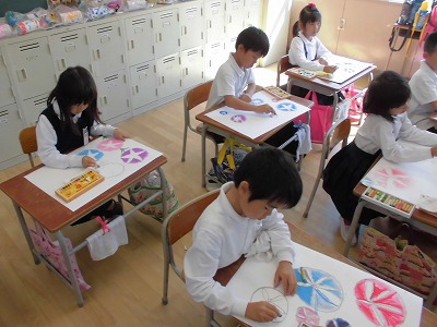 このクラスでは、パスを使って、1学期や夏休みに育てていた「あさがお」の花を思い浮かべながら描いていました。
