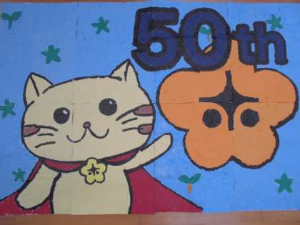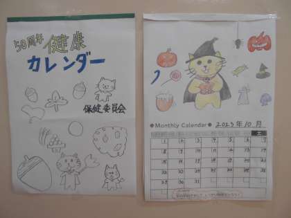 創立50周年を記念して、保健委員会で、掲示と健康カレンダーを作りました。掲示は保健室前にはっています。健康カレンダーは各学級にはっています。健康カレンダーには、毎月の「健康目標」をのせています。読んでください!