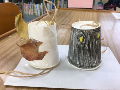 その集めた落ち葉や木の実を使い、紐をひくと上に上がっていくおもちゃを制作しました。