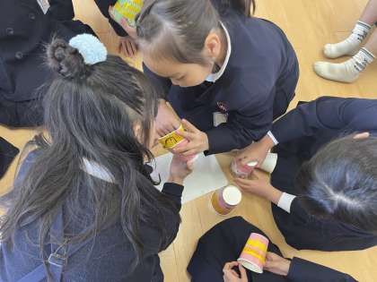 牛乳パックやラップ芯、ペットボトルキャップなど、ごみになるものが楽しいおもちゃに変身し、楽しいひと時を過ごすことができました。