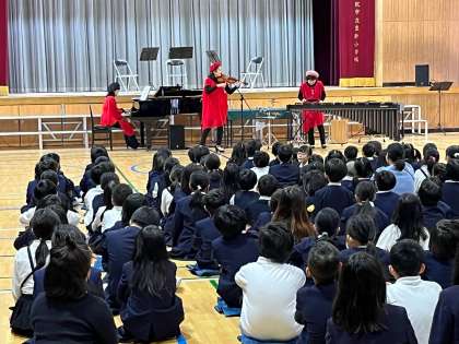 高学年(4〜6年)と低学年(1〜3年)の二部に分かれて、ローゼンビートをお招きして、音楽鑑賞会を実施しました。