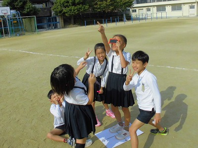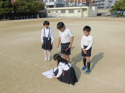 このクラスでは、太陽について学習しているようで、遮光眼鏡で太陽の位置を確認し、東西南北の方位の書いた画用紙に、時間ごとの太陽の方向と影の様子を記録していました。