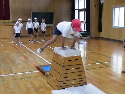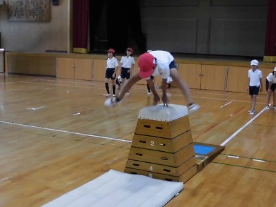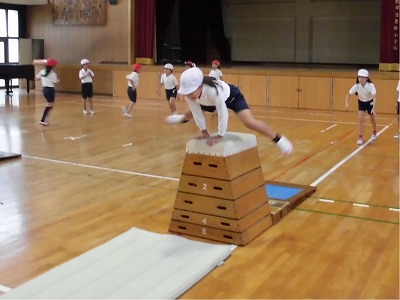 授業を見たときには、3段の高さをグループで連続して、かけ声を出しながらリズミカルに跳んでいました。