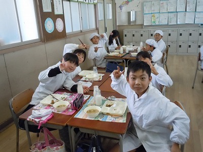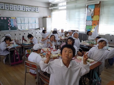 「お好み焼き」は山芋入りで、給食室で粉から調理しています。トンカツソースの小袋もついていて、子どもたちは喜んでいました。