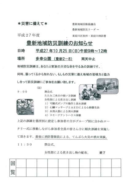25日の日曜日は、豊新地域の「防災訓練」が多幸公園にて実施されます。