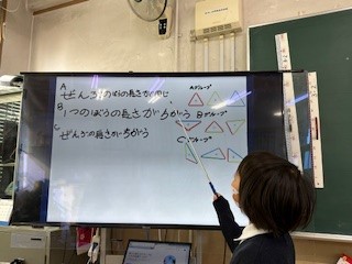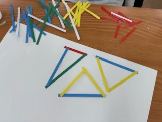 今日は、教科書の最後についているカラフルな棒を使っていろんな形の三角形を作りました。