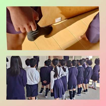 校内にかくされたほうにゃんシールを、1〜6年生の各クラスで協力して探します。