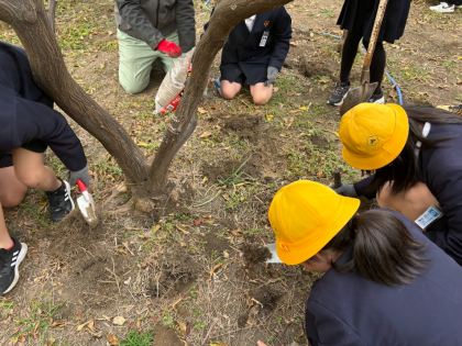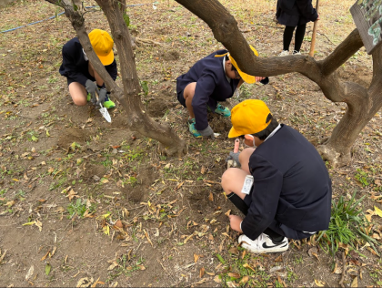 本日、栽培委員会は来年もみかんがたくさん実るように願いを込めながら寒肥作業を行いました。みかんの樹の周りを少し掘って、肥料をまきました。「来年も食べたいな」「美味しくできるといいな」なんて話しながら取り組みました。