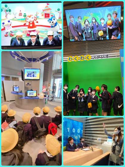 NHK放送局ではクロマキー合成体験やニュースキャスター体験をしたり、現場で働く方の努力やニュースができるまでのお話を聞いたりしました。