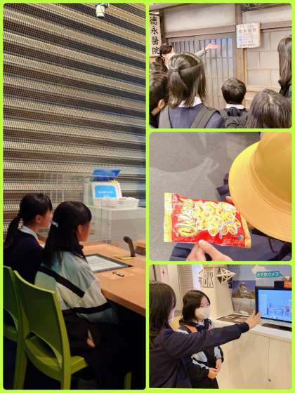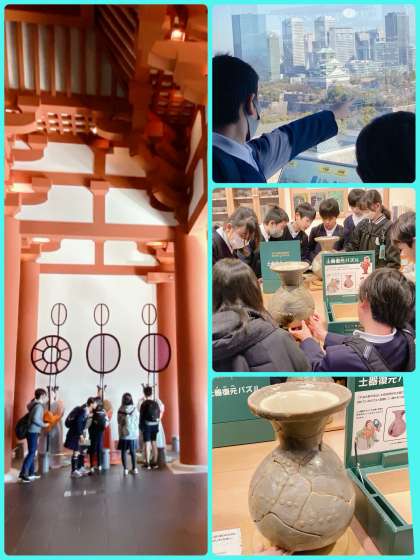 歴史博物館では昔の展示や大阪の様子を映像や実物で知ることができました。土器復元パズルや地層パズルは班で夢中になり、協力して完成させていました。