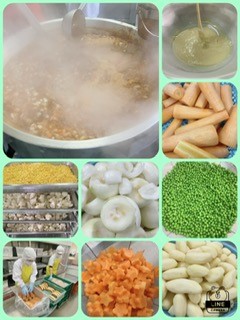 ビーフシチューは小麦粉と綿実油でルウを作ります。綿実油で牛肉を炒め、たまねぎ、にんじん、じゃがいも、湯を入れてから煮込んで、いろどりにグリンピースを使用してます。