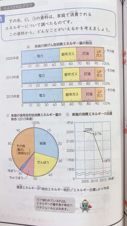 年代別による数値の増減を読み取るだけでなく、円グラフから「何かを温めることはとても消費エネルギーが多い」「電気の消費量は2005年から2015年で増えているようにみえるけど、総消費エネルギー量をもとに計算すると実は2005年の方が消費量が多い」ということに気が付きました。