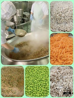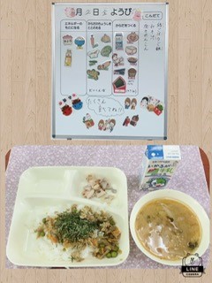 鶏ごぼうご飯はしょうが汁で下味をつけた鶏ひき肉を主材に、つきこんにゃく、ごぼう、にんじん、グリンピースを使用しています。児童生徒に大変好評な混ぜご飯です。きざみのりが1人1袋ずつつきます。