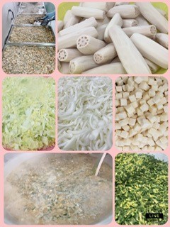 焼きれんこんは塩、綿実油で下味をつけた冬野菜のれんこんを焼き物機で焼きます。ホクホクしておいしく仕上がっています。れんこんには、ビタミンCも豊富に含まれていて、その量はみかんの約1.5倍だそうです。