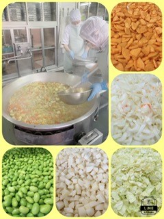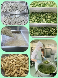 わかさぎフライは冷凍まま、170度のなたね油であげています。わかさぎは海で成長して、卵を産む時期に川をのぼってくるものと、湖にすんでいるものに分かれています。わかさぎは骨がやわらかく、丸ごと食べることができます。