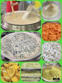 ほうれんそうのクリームシチューは、小麦粉と綿実油でホワイトルウを作り、クリームでコクを出しています。エリンギは食感を楽しむために厚めのたんざくぎりをしています。にんじんはラッキーにんじんが入っています。