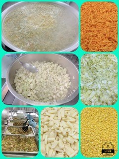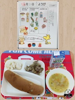 コーンとはくさいのスープには、スイートコーン(クリーム缶)とコーンのほか、鶏肉やじゃがいも、はくさい、にんじん、青みにパセリを使っています。