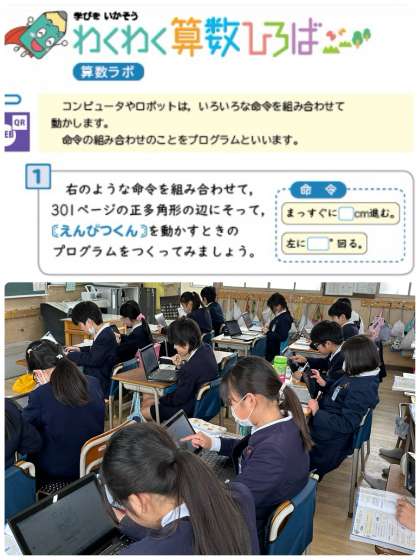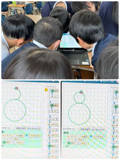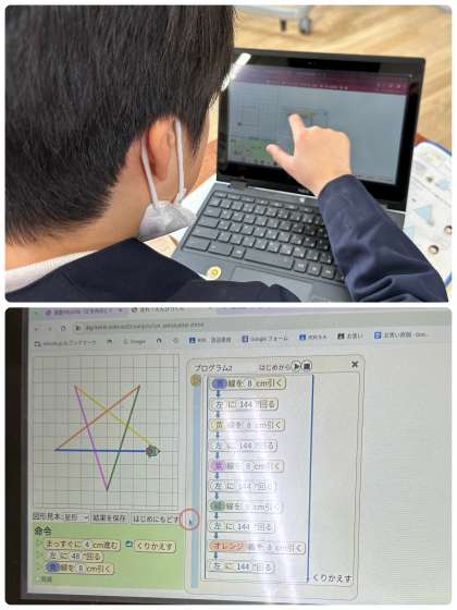 プログラミングソフト「えんぴつくん」を使って、正多角形をかくプログラムをつくりました。3学期に学んだことを生かして正多角形をかくだけではなく、星やおにぎり、雪だるまなどをかくプログラムを自分たちで考えてつくることができました。