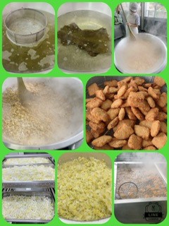 一口トンカツは冷凍のまま、なたね油であげています。配色時にご飯を盛りつけた上から具と一口トンカツをのせます。
