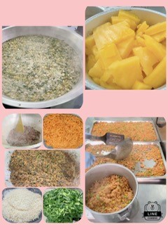 さけのカラフルそぼろは、紅ざけ(フレーク)、むき枝豆、コーンを混ぜ合わせて、砂糖、塩、ワインビネガー、うすくちしゅうゆで下味をつけ、焼き物機で焼きます。