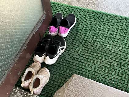 真ん中の写真は、講堂で学習している子ども達が靴を脱いできちんときれいに置いているところです。やり続ければ、ご覧のように言われなくても良い生活習慣としてできるようになります!