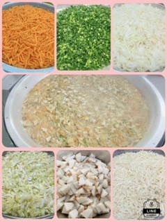 五目汁はだしこんぶとけずりぶしでだしをとって、にんじん、たまねぎ、はくさい、えのきたけ、かまぼこ、青みにねぎを使っています。