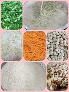 中華がゆは、肉だんごを使った児童に好評な献立です。だいこん、にんじん、しいたけ、彩りにチンゲンサイを使っています。ごま油を使用することで、中華風に仕上げています。