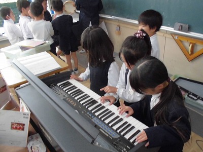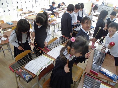 このクラスでは、いくつかの楽器を使って、合奏の練習をしていました。