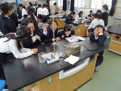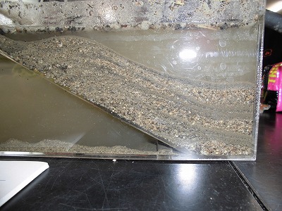 今日はその中の「地層のでき方」を学んでいて、実験装置で「れき」「砂」「どろ」が混じった土に水を流し入れて、層ができるかを実験していました。
