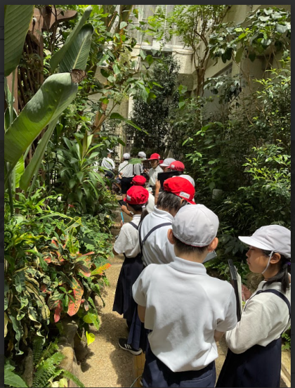 箕面昆虫館では、珍しい虫に驚いたり、感動したり・・・また、放蝶園では、自由に飛び回る蝶の姿を観察しました。ときには、蝶々が、帽子や服にとまることもありました。