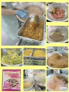 ミートソーススパゲッティは、児童に人気の献立です。牛ひき肉、豚ひき肉をいため、にんじん、たまねぎ、ピーマンをいためて、ケチャップ、トマトピューレ等の調味料で味付けし、上新粉でとろみをつけています。めんは別の釜で一気に湯がいています。