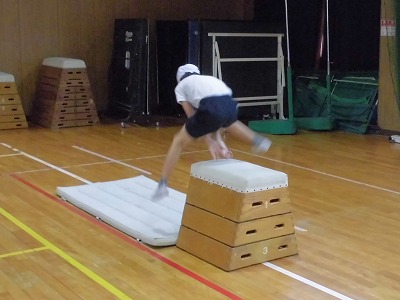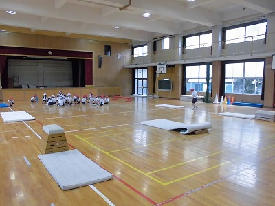 このクラスでは、講堂内にマットやとび箱、平均台を配置して、サーキットトレーニングのように、順に課題をこなしていきます。